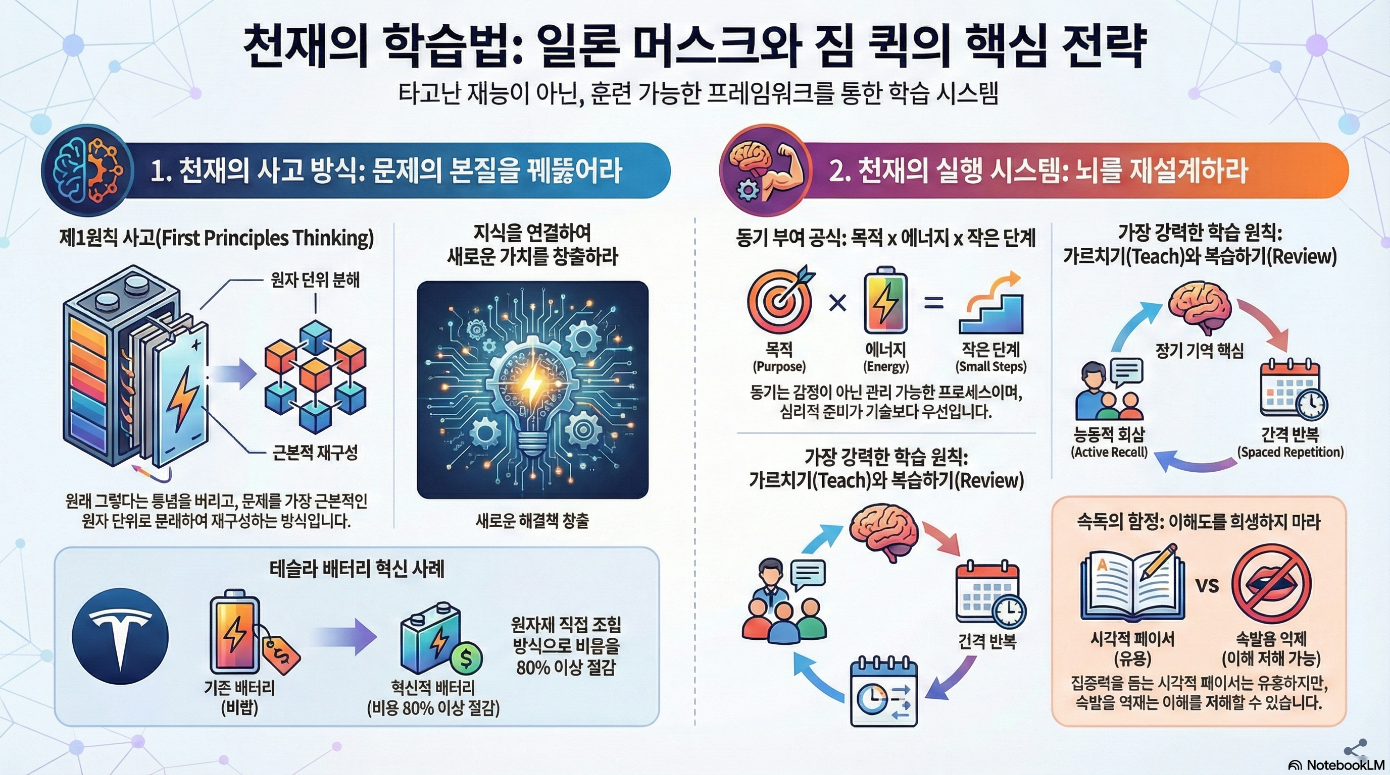- 전략적 채택을 위한 선별적 접근이 필요합니다. 전문가가 이 시스템을 통해 실질적인 성과를 거두기 위해서는, 검증된 심리적 프레임워크('성장 마인드셋', 동기 부여 공식)와 핵심 학습 원칙('가르치기', '복습하기')에 집중해야 합니다. 기억술이나 속독술과 같은 특정 기술들은 모든 상황에 적용 가능한 만능 해결책이 아니므로, 자신의 구체적인 목표와 사용 사례에 따라 그 효과와 한계를 비판적으로 평가하고 선별적으로 활용해야 합니다.