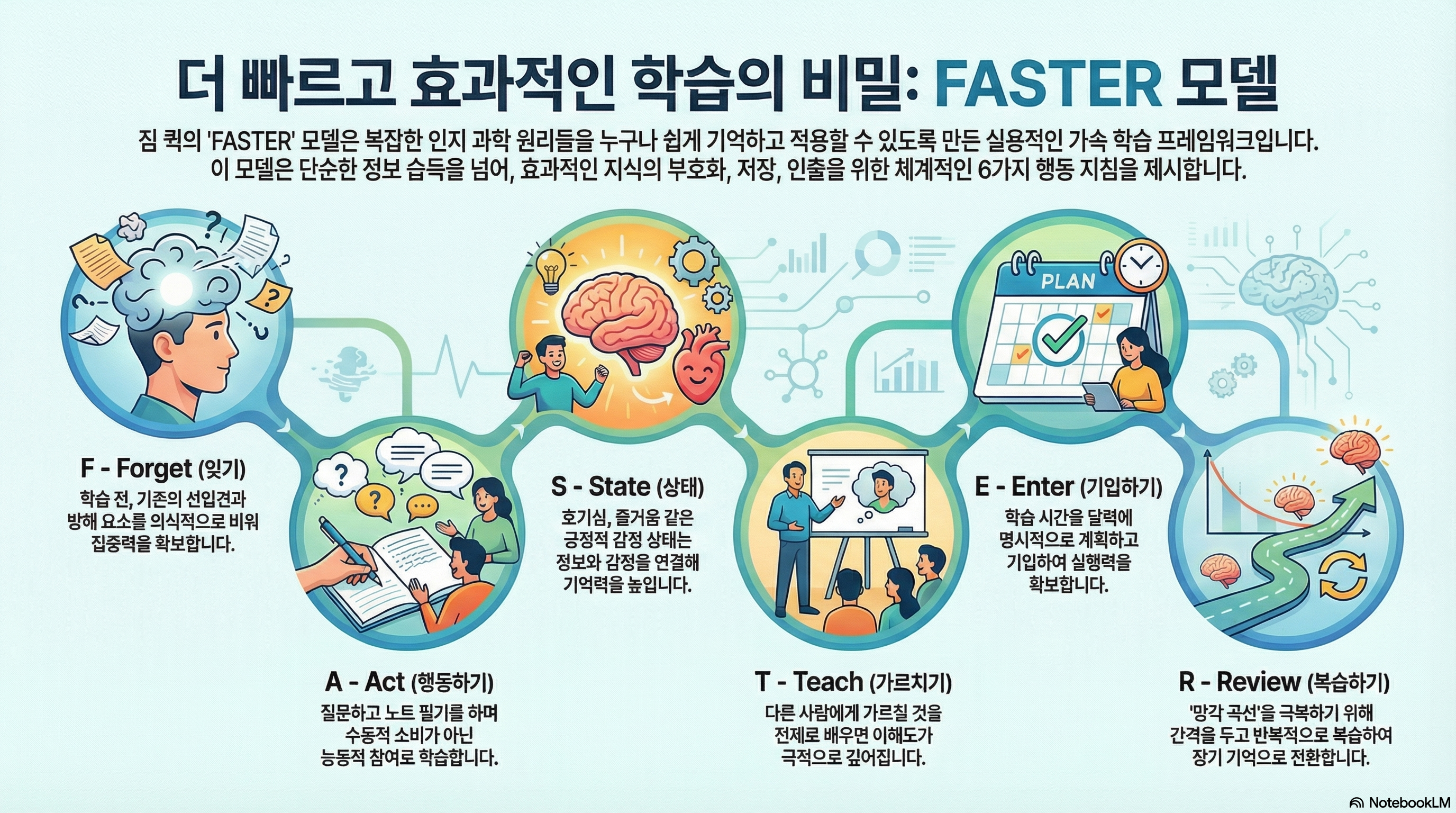 FASTER 모델은 짐 퀵의 가속 학습 방법론의 핵심 실행 지침입니다. 이 프레임워크의 진정한 가치는 복잡한 인지 과학 원리들을 누구나 쉽게 기억하고 즉시 적용할 수 있는 실용적인 약어로 통합했다는 데 있습니다. 이는 단순한 정보 소비를 넘어, 효과적인 지식의 인코딩, 저장, 그리고 인출을 위한 체계적인 로드맵을 제공합니다.
